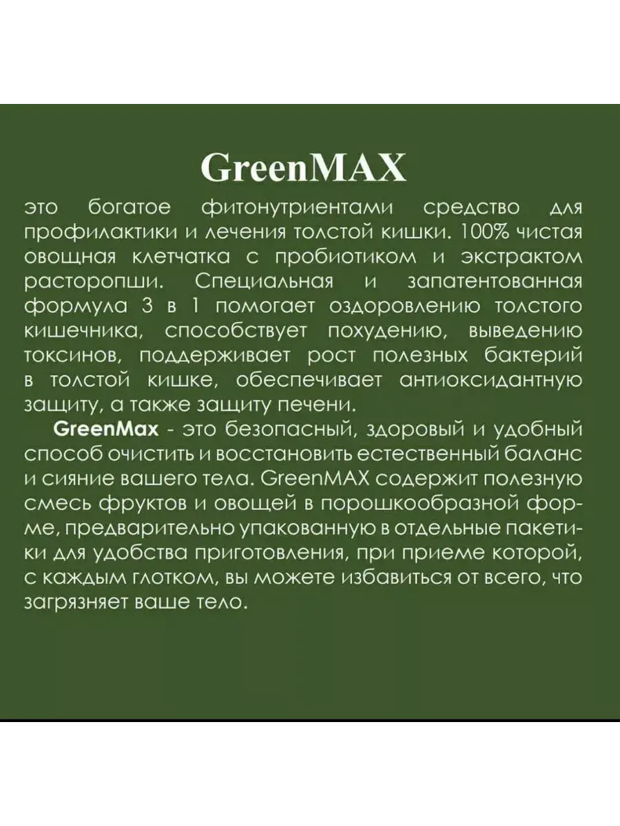 GreenMAX — это продукт для ухода за толстой кишкой, богатый фитонутриентами. 100% чистая растительная клетчатка с пробиотиком и экстрактом расторопши. Специальная и запатентованная формула «три в одном», которая способствует здоровью толстой кишки, способствует похудению, выводит токсины, поддерживает рост полезных бактерий в толстой кишке, обеспечивает антиоксидантную защиту и защиту печени.