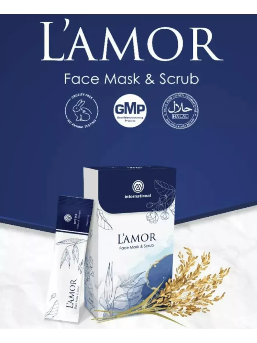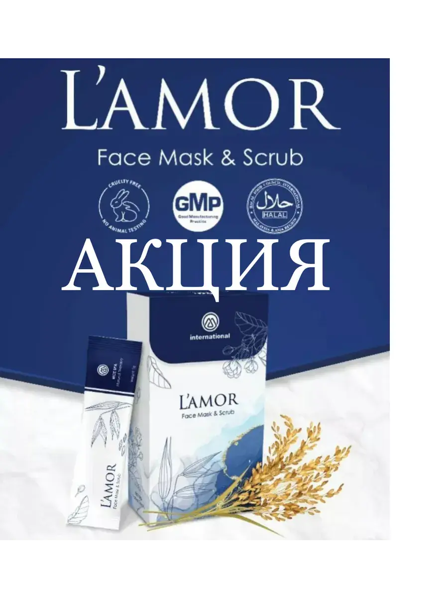 L’AMOR – порошок, берём ¼ саше, высыпаем, добавляем пару капель воды, делаем консистенцию сметанки, наносим на кожу лица и декольте на 15 минут.